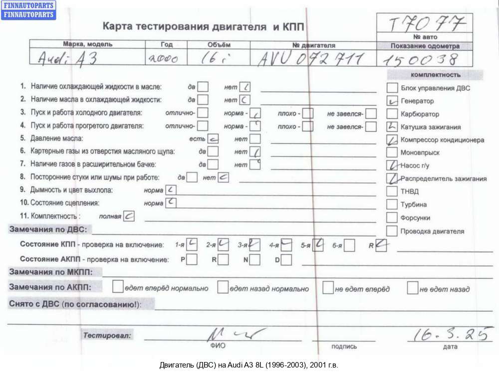 Пенза | 2002 | 038100040D, 038100098JX, 2002, 1.9л, Дизель, TDI, ATD, ATD290188, 038100040D, 038100098JX, Хэтчбэк 5 дв., синий, ATD290188 | - | Г | С | Н | ТУ, прокручивается, состояние ГРМ - нормально, поддон - нормально, клапанная крышка - нормально, эмульсия - нет сломана трубка щупа ,скол корпуса крышки масленого фильтра ,на генераторе клин обгонной муфты, | |||
