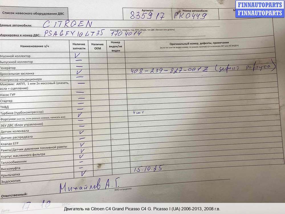 Ханты-Мансийск | 2007 | 0135QA, 2007, 2л, Дизель, HDI, RHJ, PSARHJ10DYUR4019028, 0135QA, Минивэн, серебристый, Фото не актуально, с запчасти отделены: Маховик, Генератор, PSARHJ10DYUR4019028 | - | К | КК | ТУ, прокручивается, состояние ГРМ - нормально, поддон - нормально, клапанная крышка - нормально, эмульсия - нет, 2 массовый маховик, бит клапан воздушный, | |||
