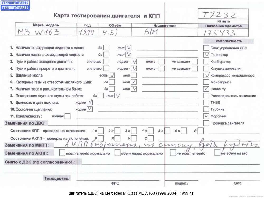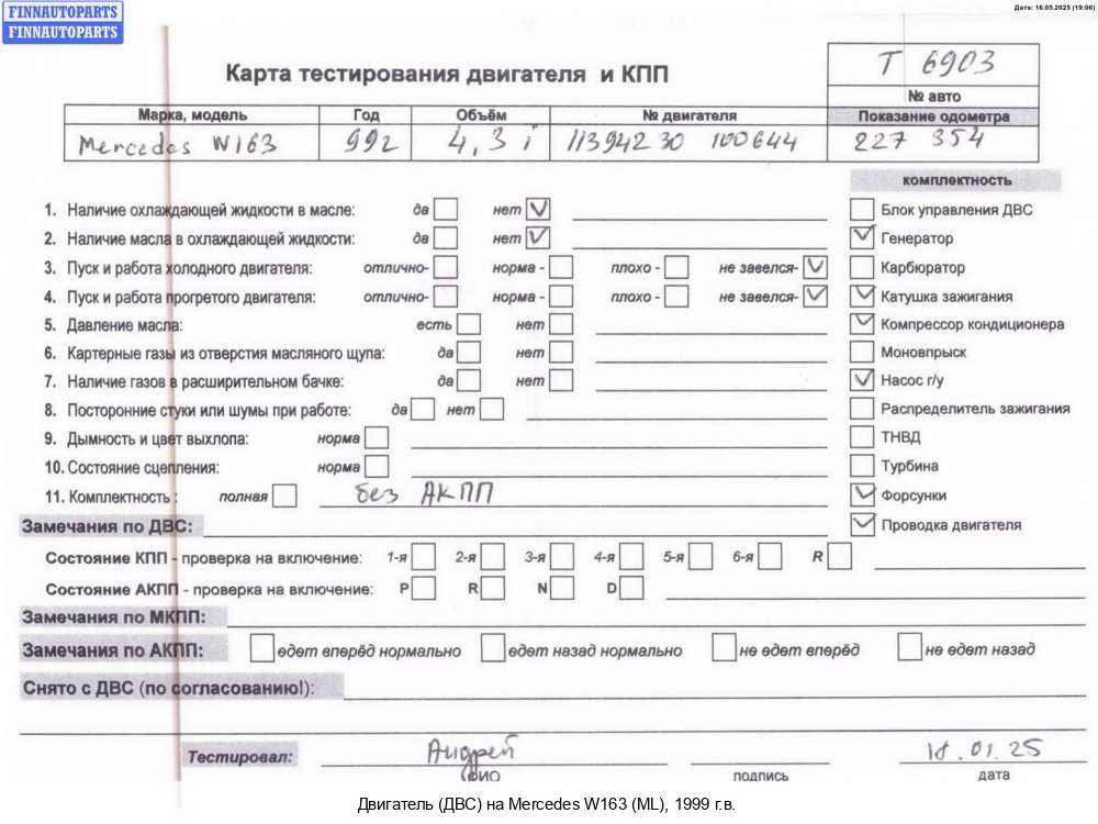 Нижний Тагил | 2004 | A6120105002, 2004, 2.7л, Дизель, CDI, OM 612.963, Б/Н (612963), A6120105002, Джип (5-дверный), черный, Фото не актуально, с запчасти отделены: Прочая запчасть, Насос гидроусилителя руля (ГУР), Генератор, Патрубок интеркулера, Б/Н (612963) | - | К | КК | ТУ, прокручивается, состояние ГРМ - нормально, поддон - нормально, клапанная крышка - нормально, эмульсия - нет, закоксован, | |||